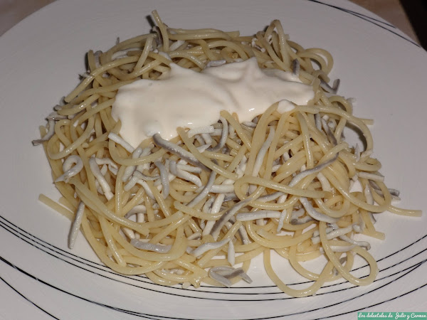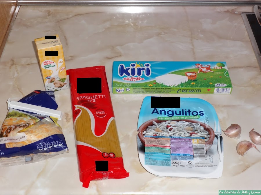 Miramos en la despensa y en la nevera, y vimos que con los ingredientes que teníamos (que no eran muchos) se nos ocurría un plato de pasta original y que podía no estar nada mal. ¿que tal quedaría el sabor de las angulas sucedáneas al ajillo con una salsa de queso cremoso como el Kiri? ¿Y si a esto le añadimos unos espaguetis? La respuesta a estas preguntas las respondimos en la mesa el día de la visita: no dejamos nada en los platos.