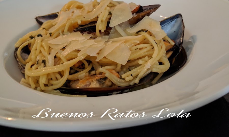 Servimos en cada plato un poco de pasta con la ración correspondiente de mejillones y unas lascas de parmesano que habremos cortado mientras se cocía pasta