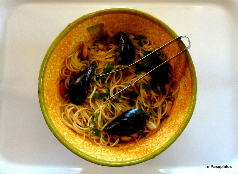 Sencilla forma de cocinar unos espaguetis y que sin embargo, tienen todo el sabor de su ingrediente principal (y casi único), el mejillón.