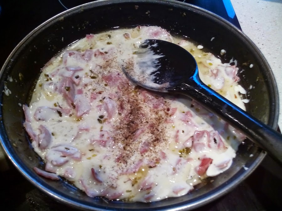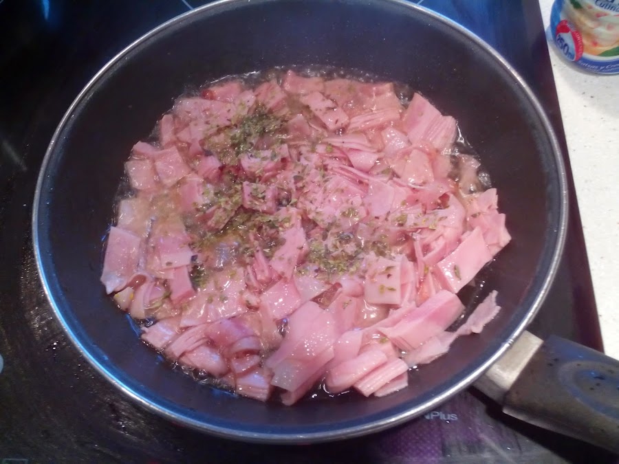 En una sartén poner un poco de aceite de oliva para marcar el jamón cortado en trocitos y un poco de orégano. Cuando ya esté echarle la nata (crema de leche), una pizca de sal y la pimienta e ir mezclando.