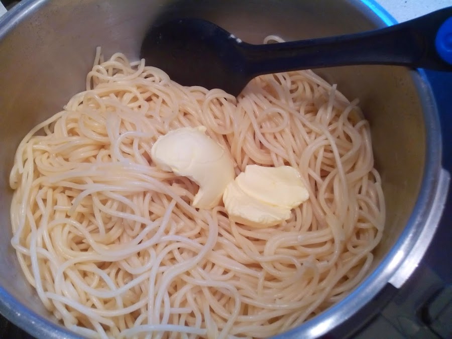 Los espaguetis escurrirlos bien, ponerlos en la tartera y echarle una cuchara de mantequilla.