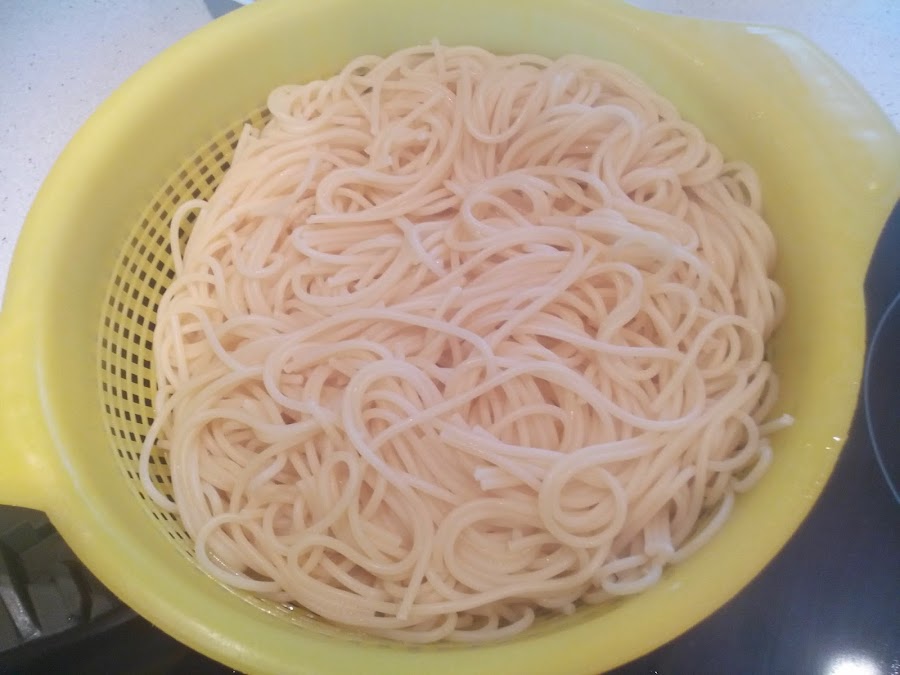 Poner una tartera con agua, cuando hierva echar la sal, un poco de aceite de oliva y los espaguetis. (tiempo de cocción según fabricante), remover de vez en cuando.