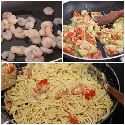En una sarten ponemos un poco de aceite y salteamos las gambas con una pizca de sal, añadimos los tomatitos partidos por la mitad y por último el pesto.