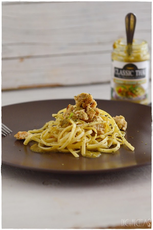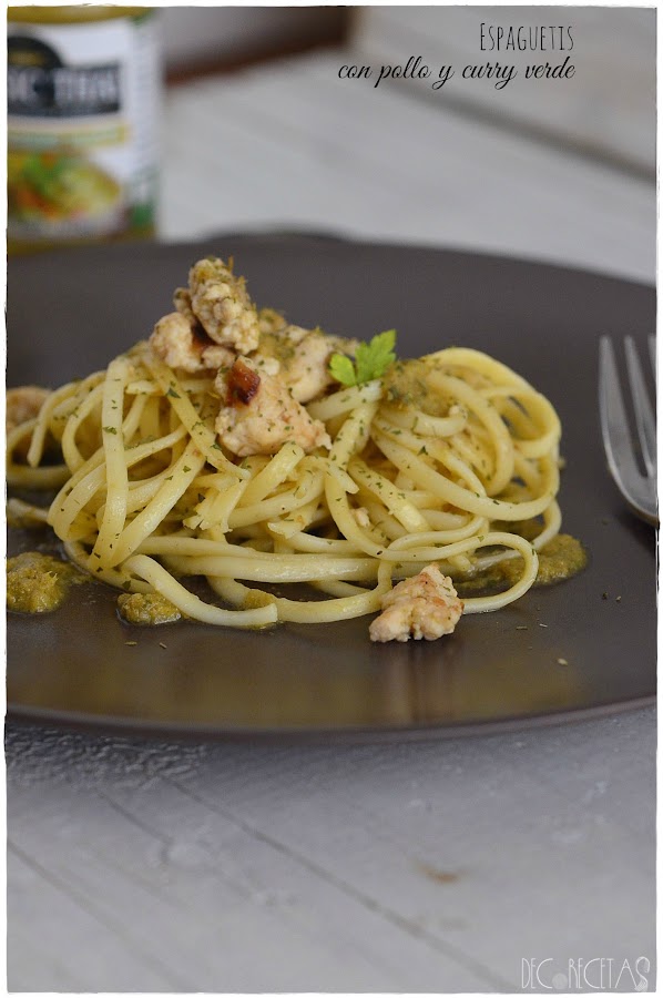 Cocemos la pasta lo que nos indique el fabricante, para reservarla una vez listo el pollo. Pochamos media cebolla a la que añadimos el pollo triturado salpimentado y por último, dos cucharaditas de pasta de curry verde. Dejamos cocinar todo conjuntamente a fuego bajo por 3 minutos y añadimos a la pasta.