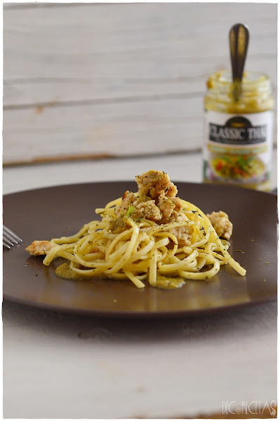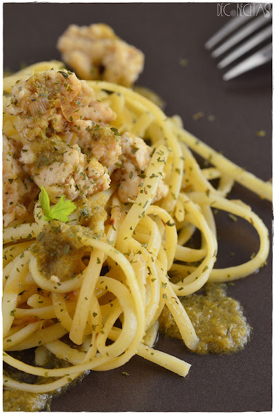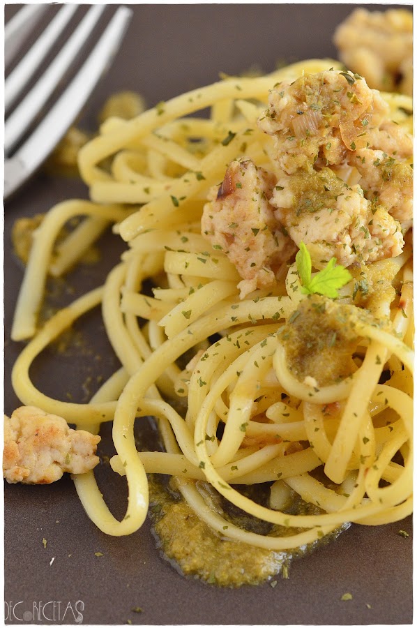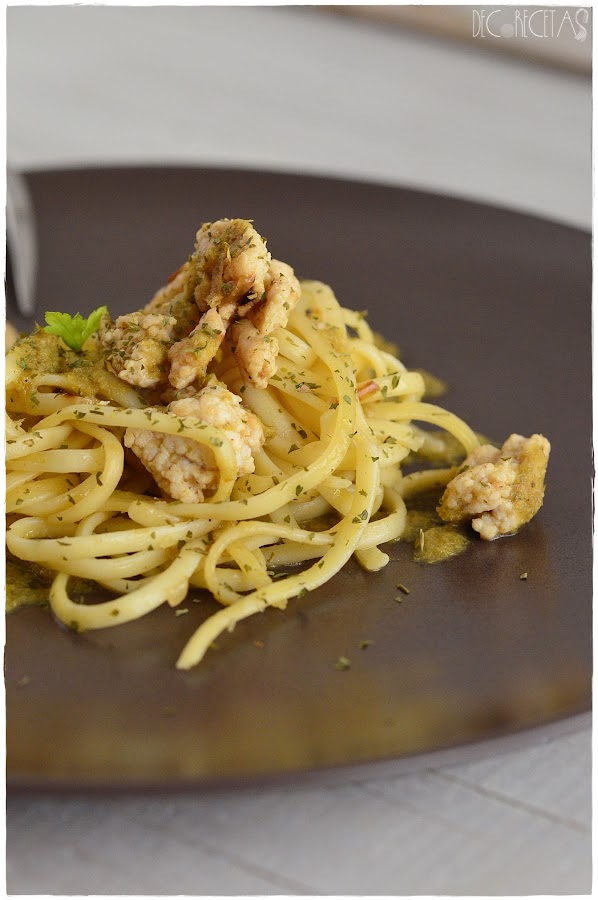 Aunque Bea lo elabore con espaguetis integrales, yo sólo tenía tallarines en casa, así que variamos la pasta en función de la despensa.