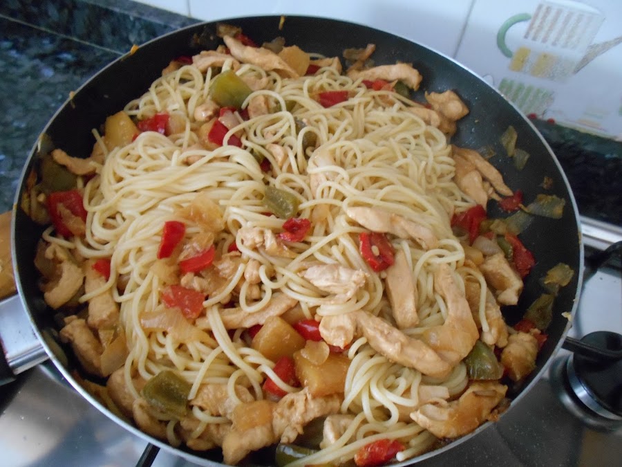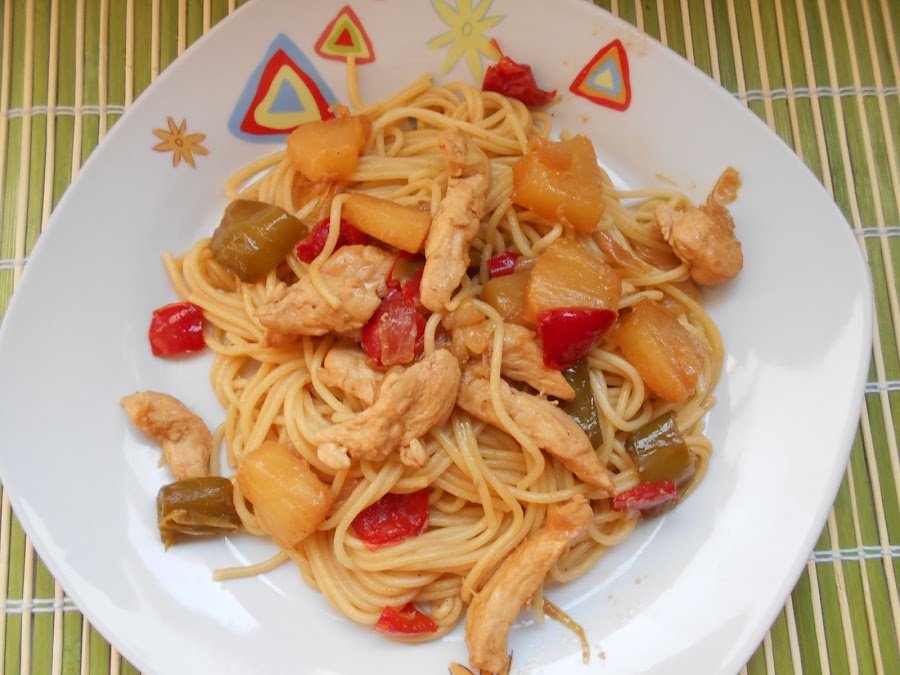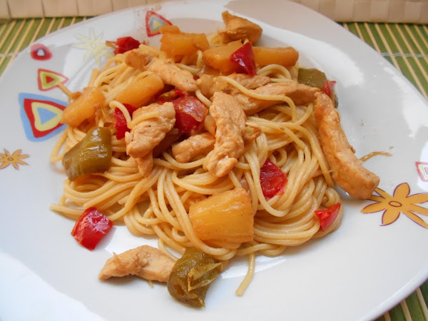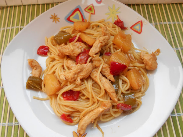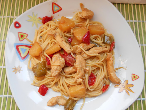 Os traigo una nueva receta de pasta, en esta ocasion la he preparado con pollo y piña y la verdad es que esta super buena.