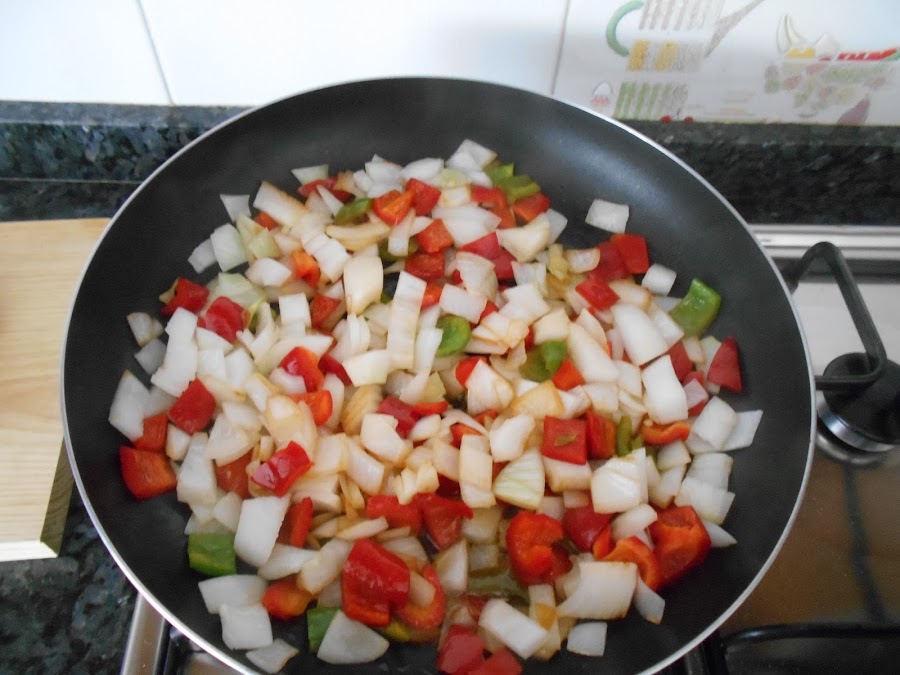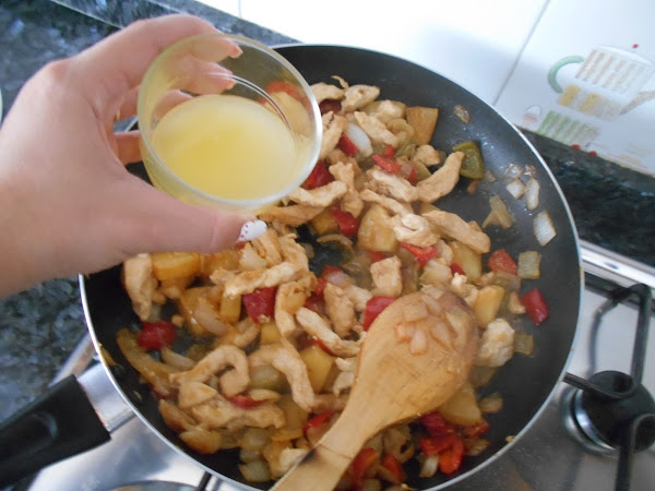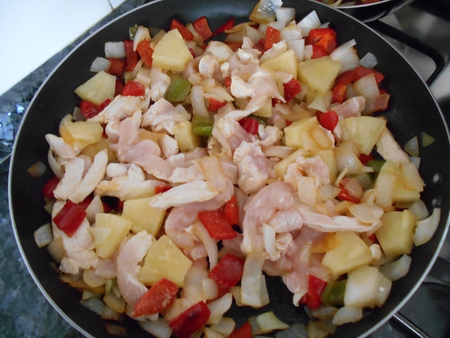 Cuando esten pochadas añadimos el pollo y la piña cortados en trocitos, doramos bien.