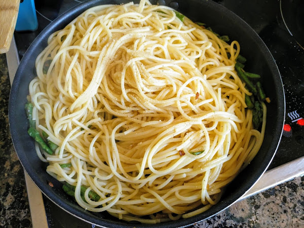 Por último, para emplatar, echamos los espárragos de nuevo en la sartén con los espaguetis escurridos.