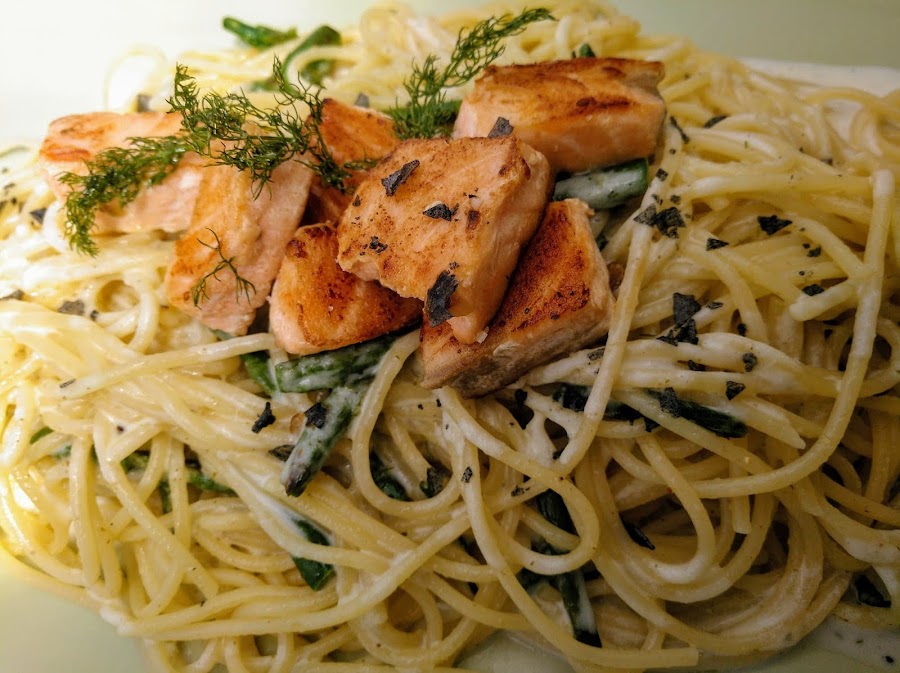 Después, ponemos los espaguetis en el plato, los rociamos con la salsa, a continuación, colocamos el salmón y las ramas de hinojo fritas.