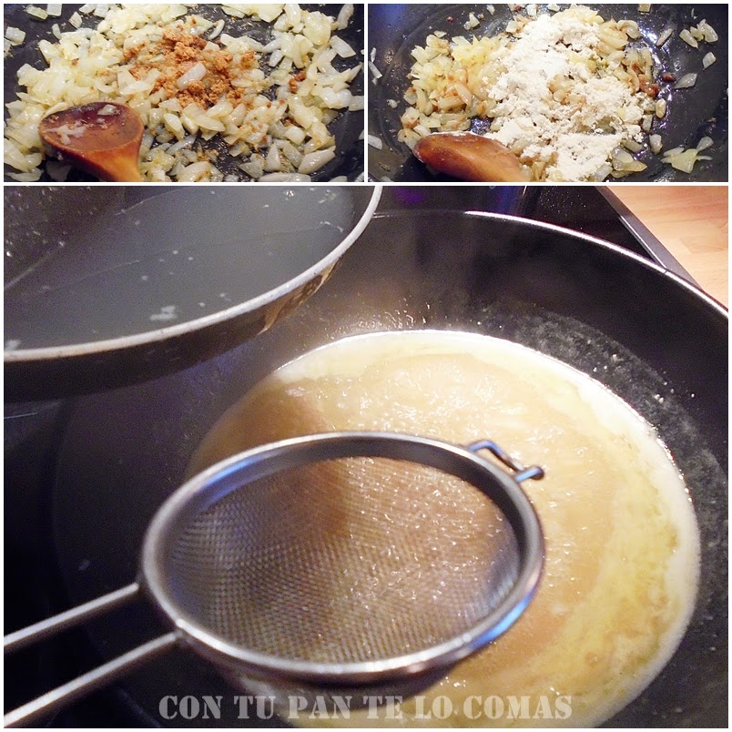 4. Cuando la cebolla transparente desmenuzamos la pastilla de caldo de pescado y removemos con la cebolla.