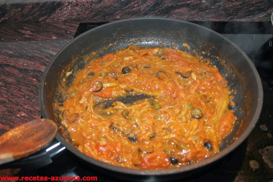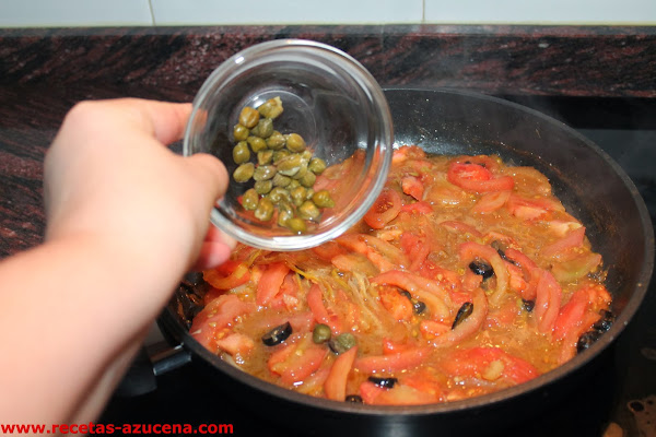 Una vez tengamos añadido el tomate lo dejaremos 2 minutos para poder añadir las alcaparras y lo dejamos sofreír hasta que el tomate se deshaga.