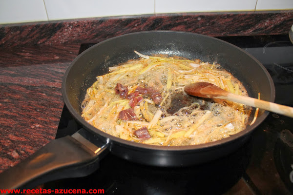 Cuando el puerro empiece a tomar color dorado añadiremos las anchoas troceadas, a las cuales le habremos quitado las espinas, removemos y dejamos sofreír.