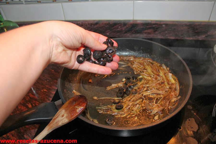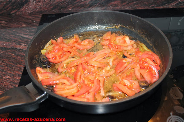 Cuando las anchoas se hallan desecho añadiremos las aceitunas laminadas, le damos unas vueltas y añadiremos el tomate.