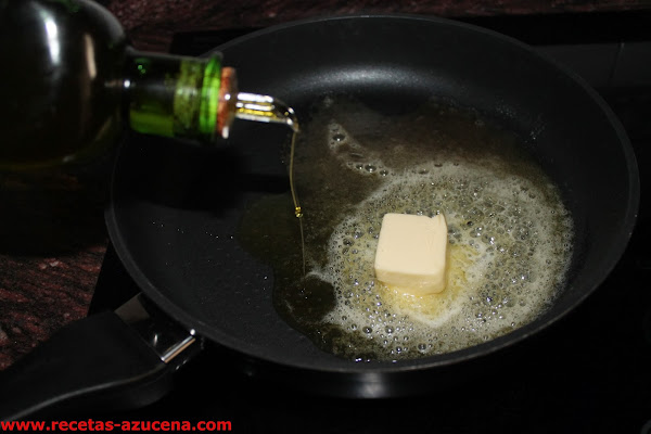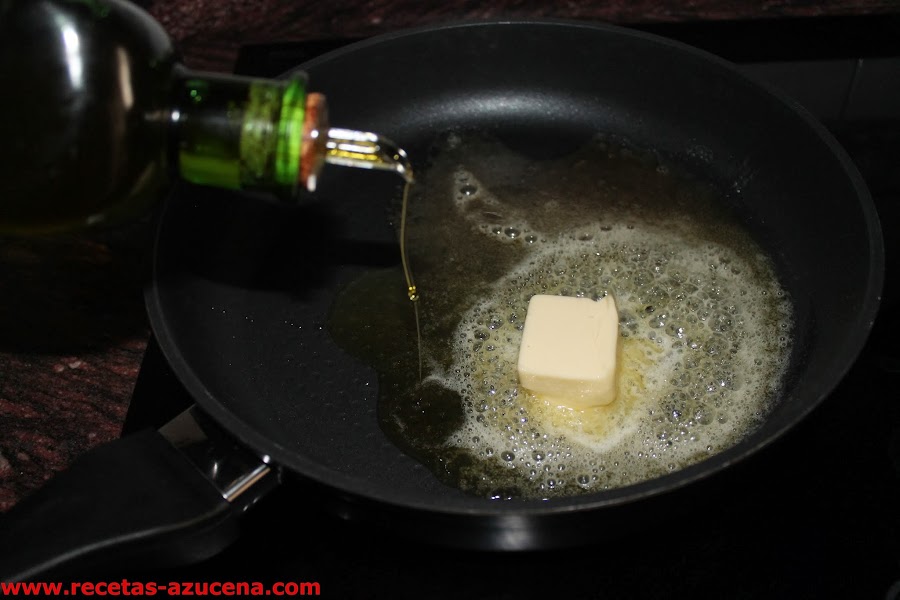 Ponemos un sartén al fuego, a fuego medio, cuando este caliente añadiremos la mantequilla junto con un chorreón de aceite de oliva como una cucharada sopera, cuando este la mantequilla derretida añadiremos el puerro y el ajo, lo dejaremos sofreír durante 3 minutos.