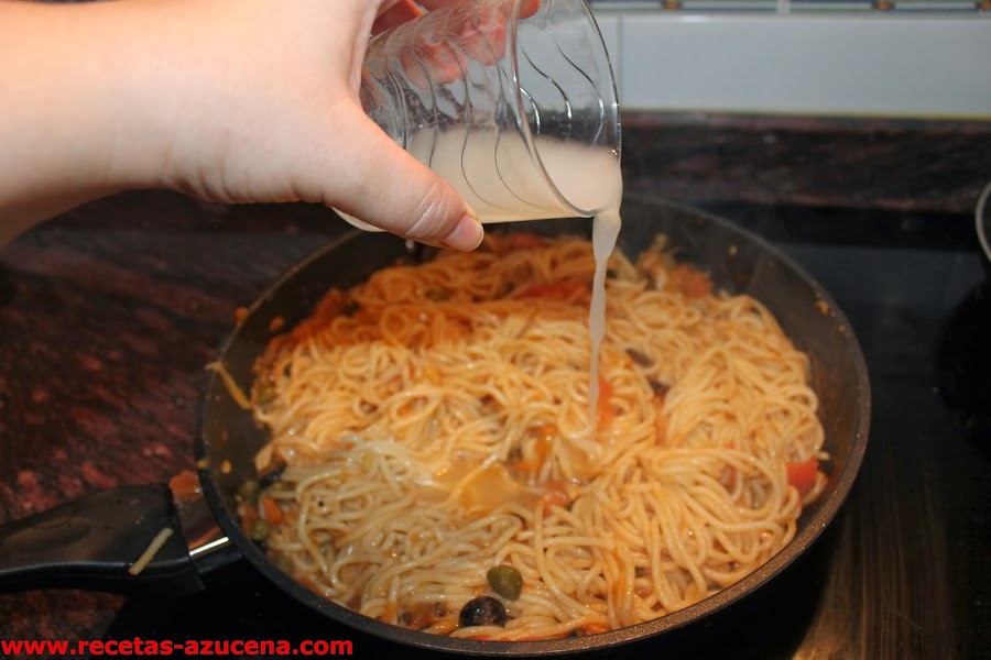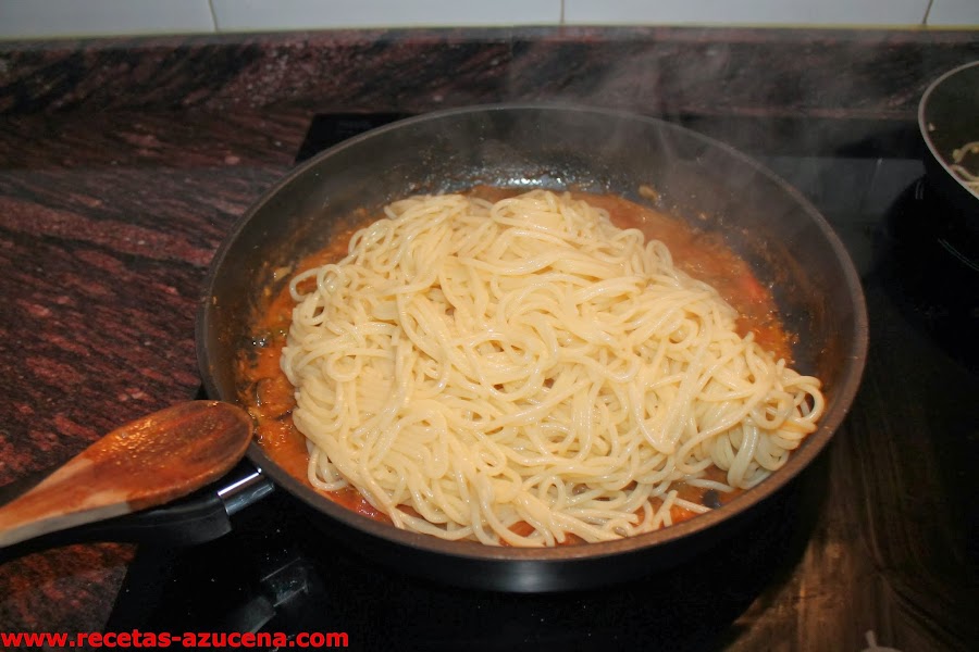 Cuando tengamos la pasta lista y escurrida la añadiremos a la sartén le daremos unas cuantas vueltas para que tomen los sabores, añadiremos agua que teníamos reservada hasta que quede a nuestro gusto de suelta y de brillo.
