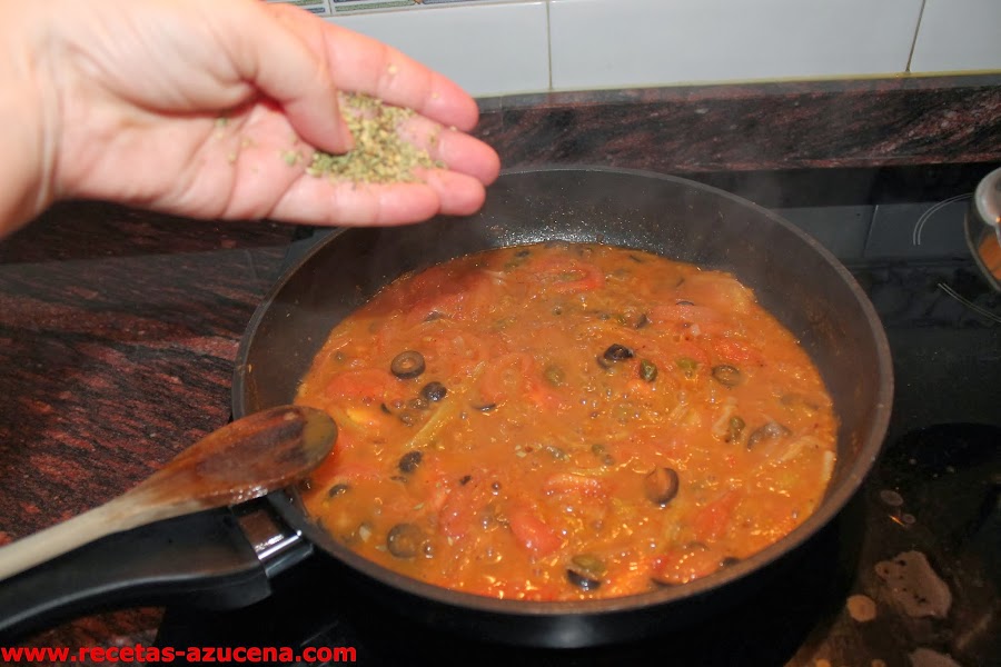 Cuando el tomate este casi desecho añadiremos el orégano, removemos todo y dejaremos que el tomate se termine de hacer y se quede todo como una salsa.