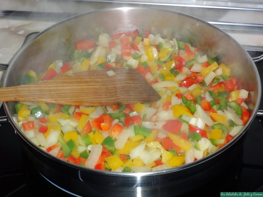 Ponemos aceite en una sarten u olla a fuego medio y vamos pochando todas las verduras (cebolla, ajo y pimientos) lentamente.