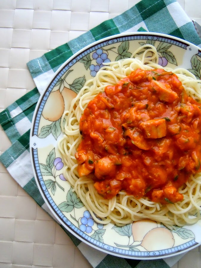 Una vez cocidos los Espaguetis, colar y escurrirlos, servirlos en platos y encima añadir varias cucharadas de salsa de tomate con el pollo y las verduras. Un plato recién hecho es una delicia, servir inmediatamente.Esa es la receta de hoy. Fácil y sencilla.