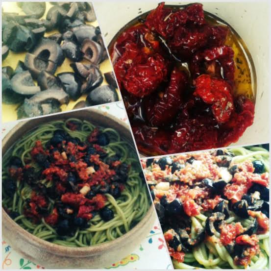 Por el otro, prepararemos la salsa de la siguiente manera: cogemos los tomates secos y los hidratamos un poco, para ello, podemos ponerlos en remojo un rato antes de preparar la receta (15 o 20 min) o bien cocerlos durante unos 5 minutos y los dejamos enfriar. Otra buena opción es tenerlos ya preparados en aceite de manera que nos servirán para utilizar siempre en el momento, consiste en cocerlos, enfriarlos y conservarlos en aceite de oliva: aquí os paso un enlace en el que Carlos Arguiñano explica rápidamente cómo hacerlo. Una vez remojados los ponemos en un recipiente con un buen chorro de aceite de oliva, un diente de ajo picado, orégano, sal y pimienta al gusto y trituramos con la batidora sin llegar a hacer un puré, mejor que queden trocitos. Finalmente, cortamos las aceitunas en cuartos, las añadimos, removemos e incorporamos la salsa a la pasta.