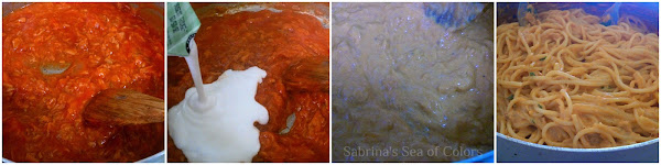 En otra olla, añadimos 1 vaso del caldo (250 ml), la cebolla hervida y picada, y las latas de atún. Cocemos unos minutos. Seguidamente añadimos el tomate frito y dejamos cocer unos minutos más, removiendo para que no se queme. Por último agregamos la nata (crema de leche) y removemos hasta espesar. Reservamos.