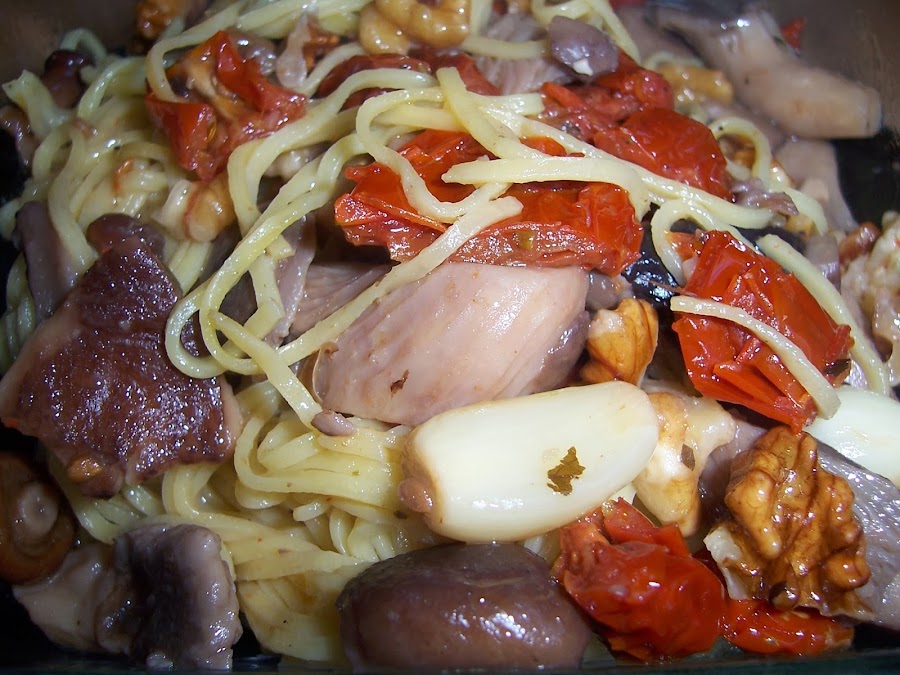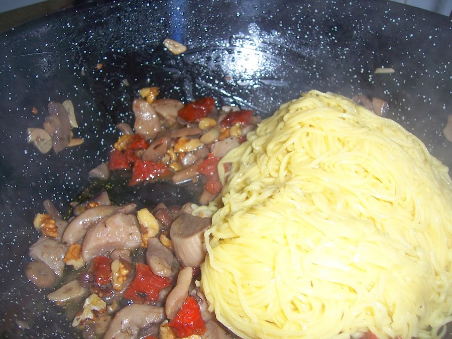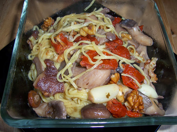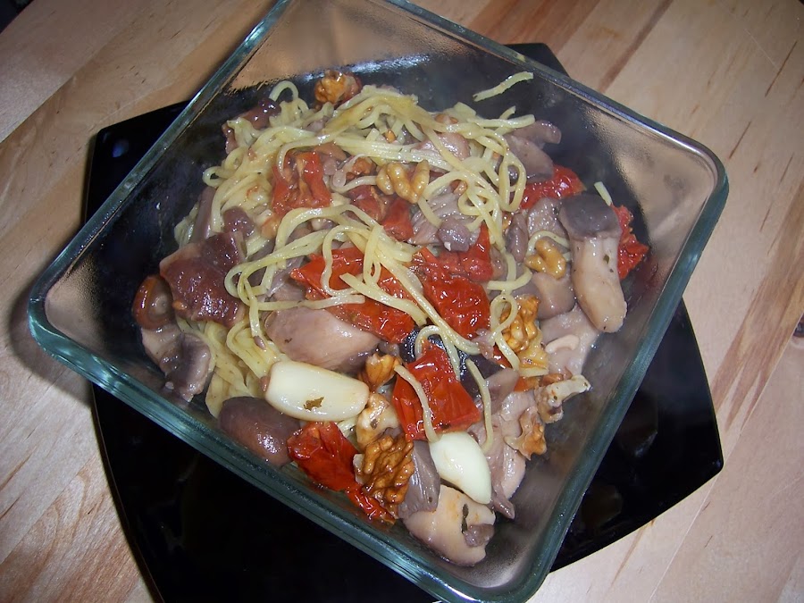 ESPAGUETIS CON SETAS, TOMATES SECOS Y NUECES