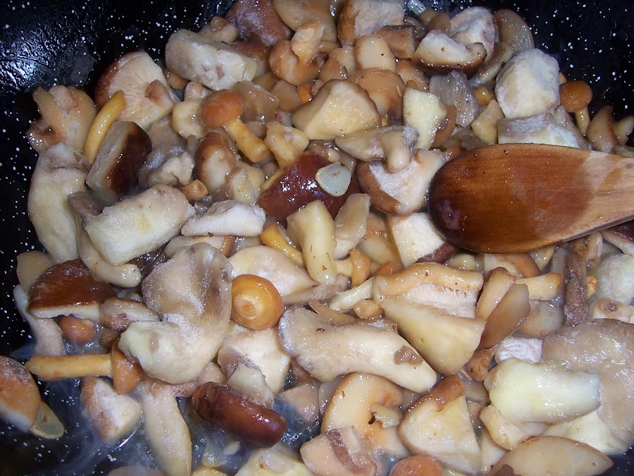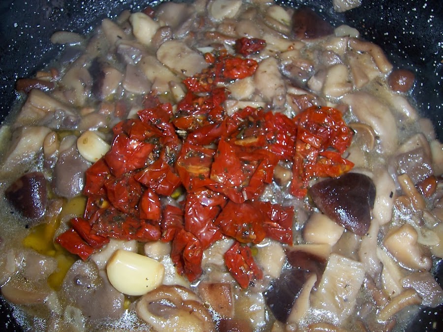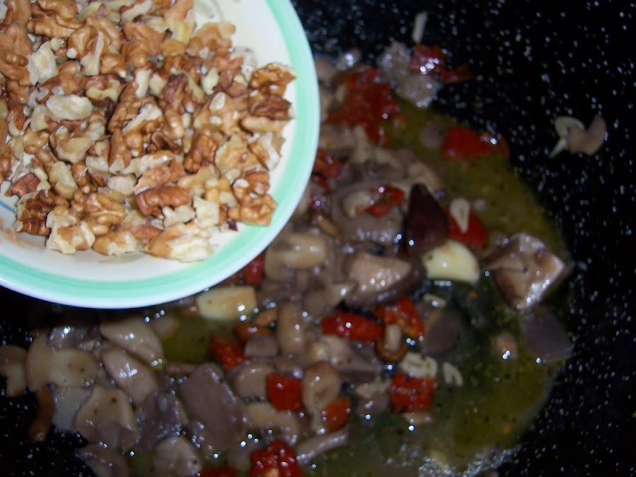 Cuando los ajos estén doraditos (cuidado que no se nos quemen) añadimos las setas y dejamos a fuego fuerte hasta que evaporen gran parte del agua que suelta y añadimos los tomates troceados y las nueces, dejamos un par de minutos y apartamos.