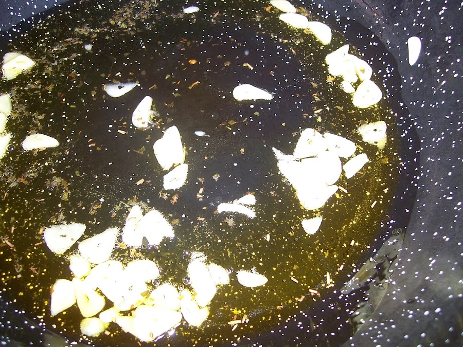 Cortamos los ajos en láminas y ponemos a sofreír con el aceite de los tomates