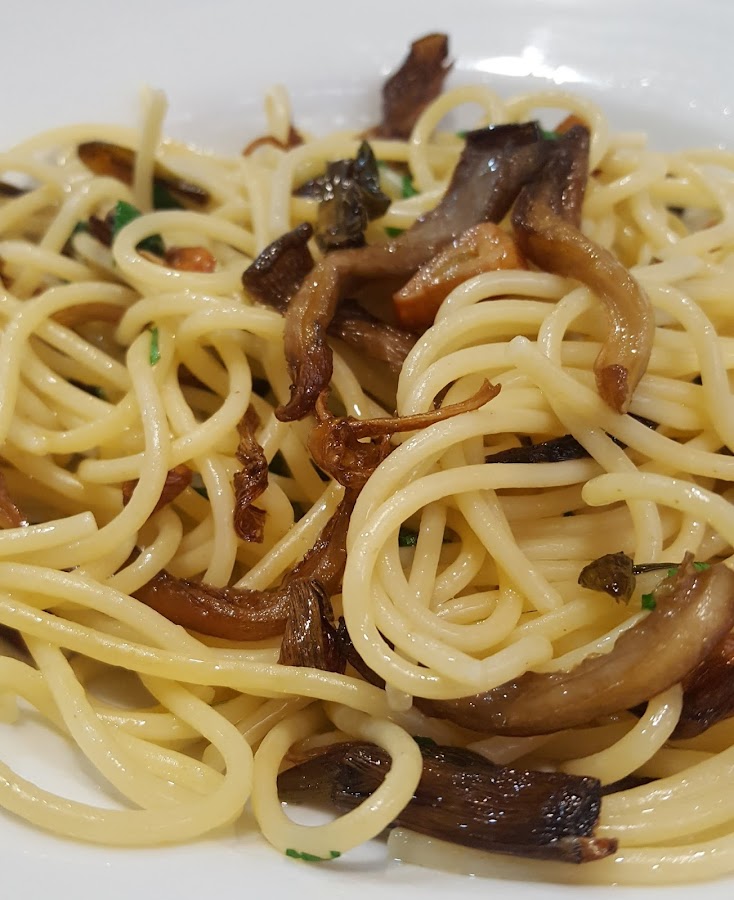 Así que mezclamos los espaguetis con las setas, espolvoreamos un poco de pimienta por encima, si os gusta el toque de pimienta y decoramos con un poco de perejil picado.