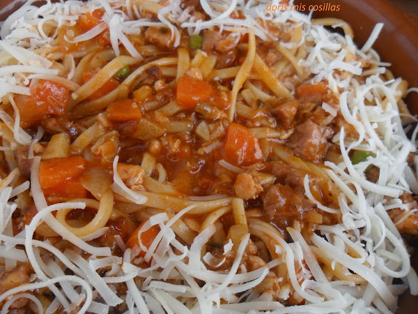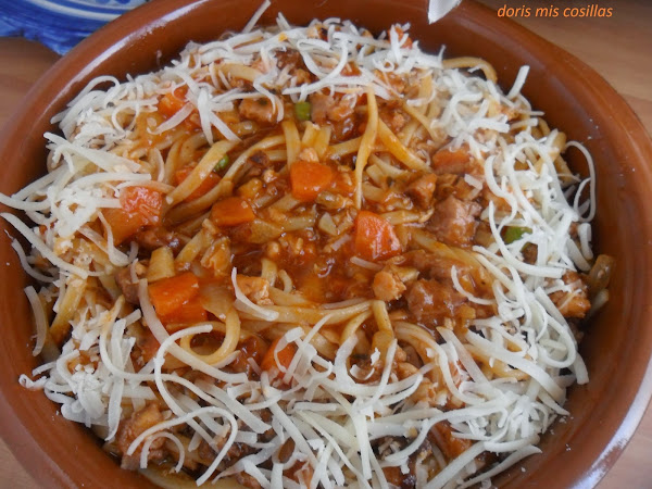 Acto seguido, agregamos la carne picada y seguir rehogando.Vertemos el tomate frito y la pasta reservada, remover bien. Lo ponemos en una cazuela de barro y rodeamos de queso rallado, si preferimos que esté dorado gratinar en el horno unos minutos antes de servir y listo.