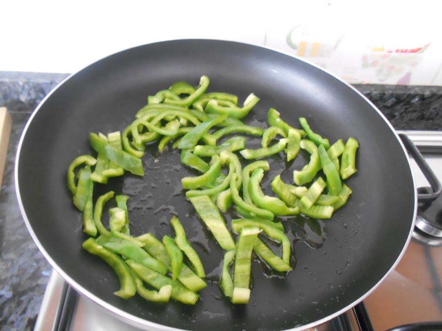 cortamos el pimiento en tiras y lo sofreimos unos 5 min en una sarten con aceite.