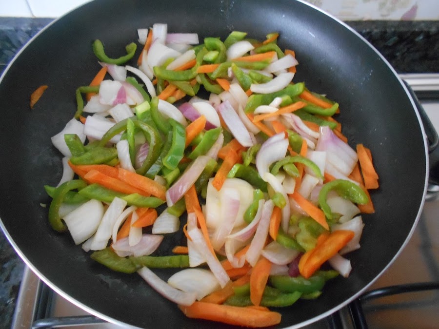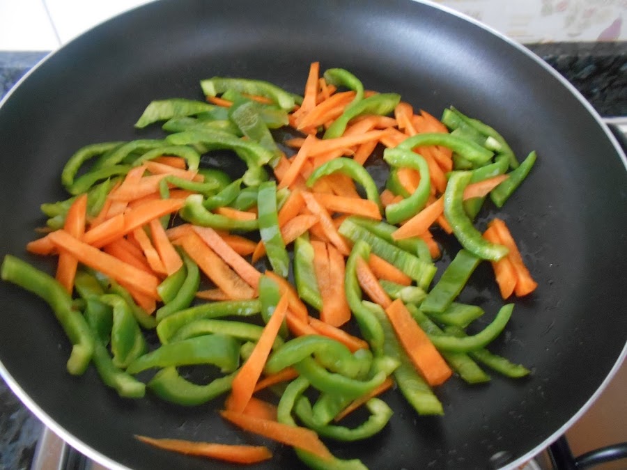 cortamos la zanahoria en tiras del mismo grosor que el pimiento y rehogamos 5 min