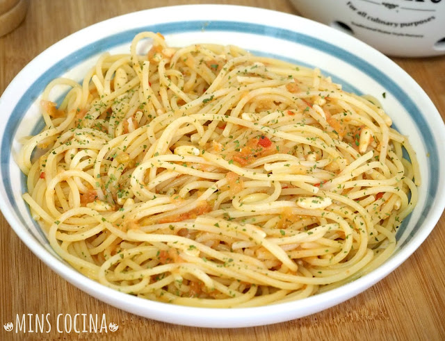 - Ponemos a cocer los espaguetis en agua con un poco de sal. Cuando estén al dente los colamos y los pasamos por el chorro de agua fría para para la cocción. Reservamos.