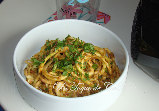 Poner los espaguetis de calabacín en un bol grande, agregar la salsa y unir bien.
