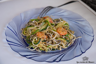 Lavamos muy bien el calabacín y con ayuda de una mandolina cortamos los espaguetis. Secamos en papel absorbente para eliminar la mayor cantidad de agua.