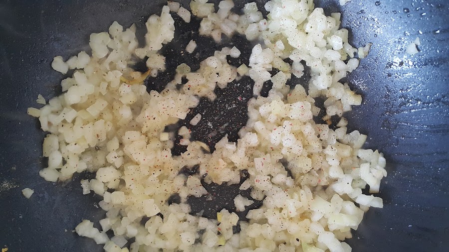 Picamos la cebolla y la sofreímos con un poco de aceite y pimienta recién molida.
