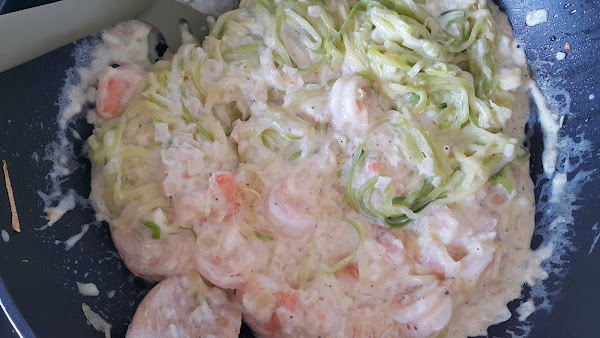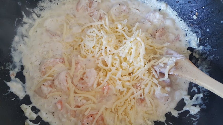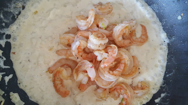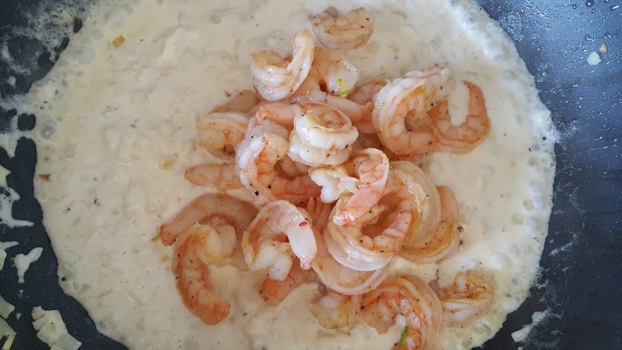 Devolvemos los langostinos a la sartén y dejamos otro par de minutos para que termine de cocinarse con la salsa.