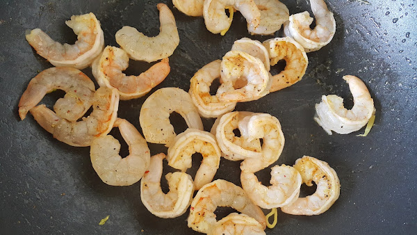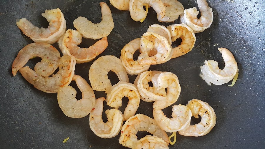 Mientras limpiamos los langostinos, les quitamos las tripas y salteamos 2 minutos en la misma sartén.