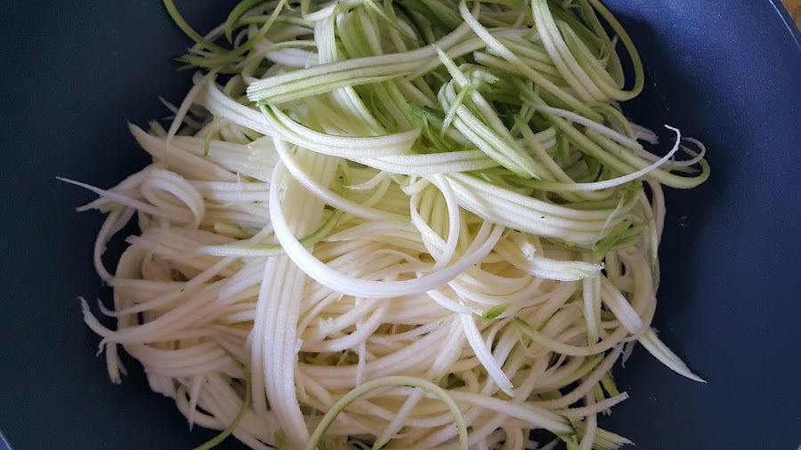 Lo primero que haremos será lavar y pelar los calabacines para posteriormente cortarlos en forma de espaguetis con la ayuda de un pelador de verduras.