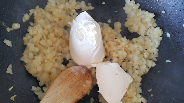 Cuando empiece a dorarse añadimos el queso crema y removemos hasta que se funda por completo. Si vemos que queda muy espeso, añadimos un chorrito de leche para aligerar.