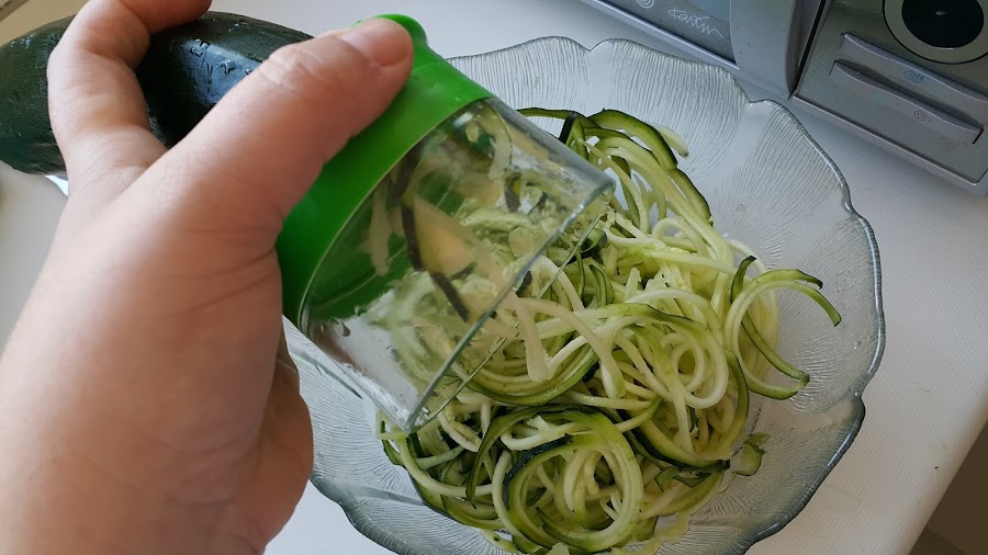 Lo primero que haremos será lavar bien los calabacines ya que no los vamos a pelar. Con la ayuda de un corta verduras, haremos unos espaguetis y los reservamos en un bol.