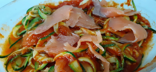 5.- Acabado el tiempo, volcamos sobre una fuente los espaguetis de calabacín, el tomate frito y las tiras de salmón ahumado.