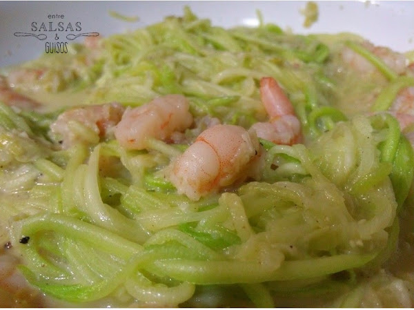 Lava y seca bien los calabacines. Con ayuda de una mandolina, los cortas en juliana, los salas y ponlos en un colador (o en el cestillo) para que vayan soltando agua. En otro recipiente descongela las gambas y escúrrelas para que suelten todo el líquido posible. (Yo usé de los paquetes congelados que vienen ya peladas, si no, deberás pelarlas y cortarlas en dos). Reserva.