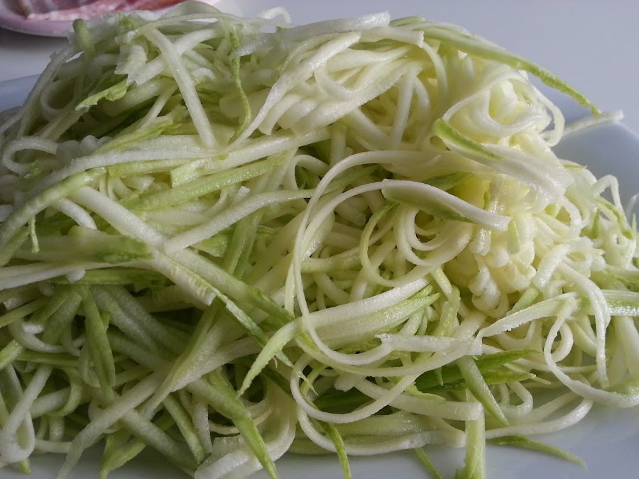 3. - Enjuagamos los calabacines y con una mandolina los vamos rallando. Quedarán como espaguetis ya cocidos.