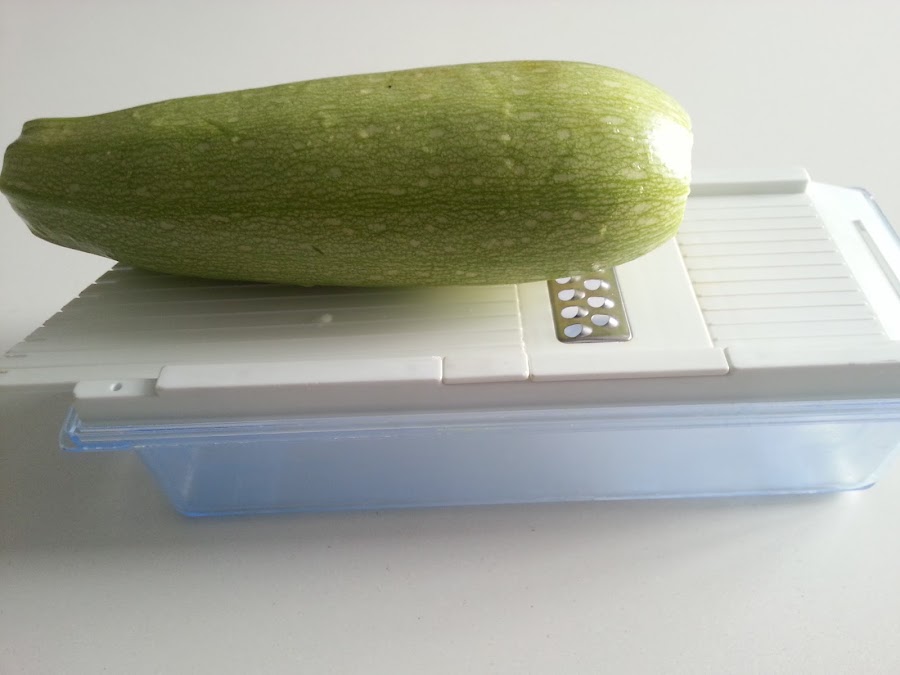 Yo he utilizado una "mandolina" para rallar el calabacín, pero si no tenéis, podéis usar un pela patatas y luego con un cuchillo, hacer tiras finas, pero es mucho más entretenido.