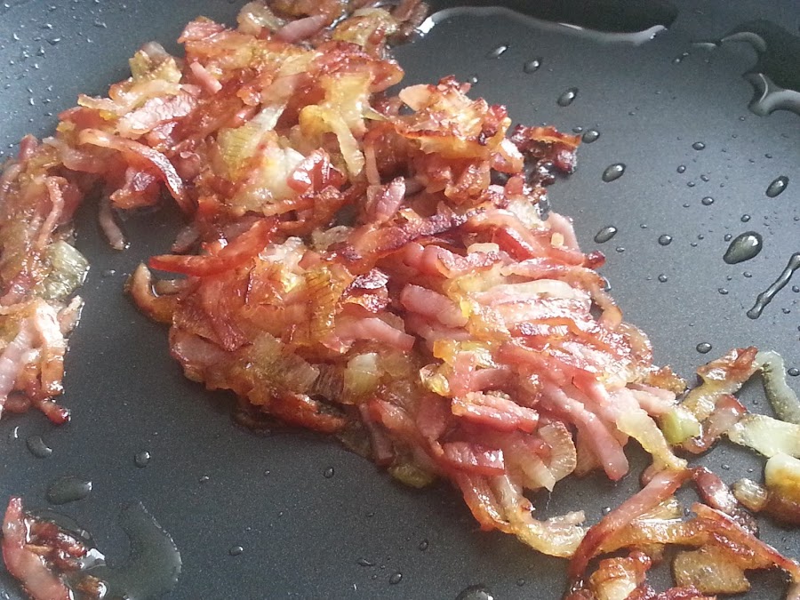 4. - Cuando la cebolla ya esté casi lista, le añadimos el bacon y dejamos que se doren, a mi me gusta bastante dorado.