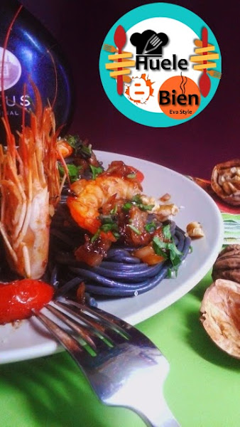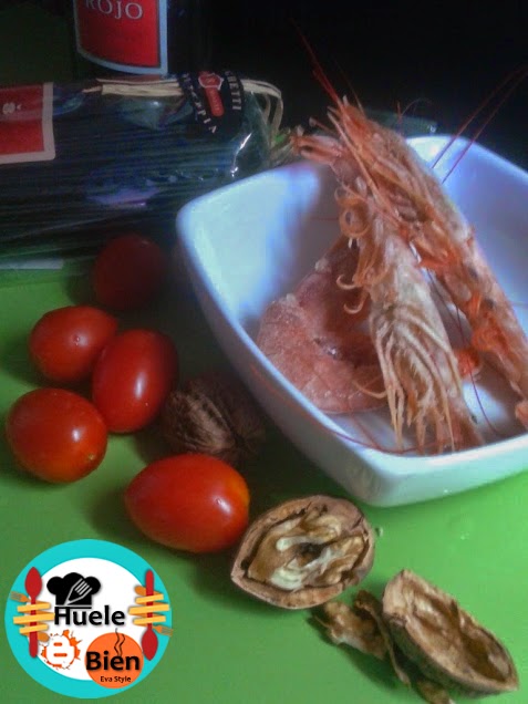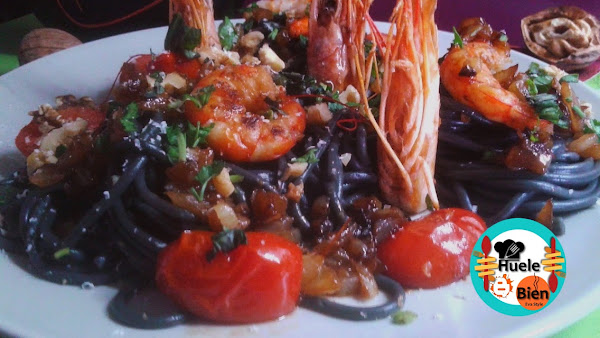 Espaguetis hechos con tinta de sepia y cocinados con gambones, nueces, tomates cherry y Vermut Rojo.