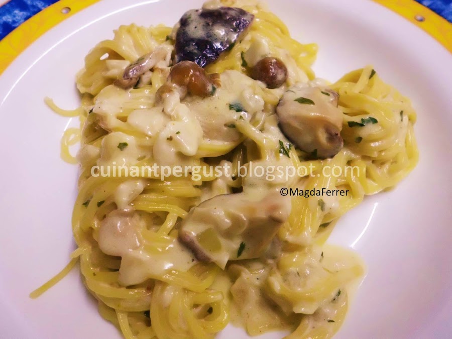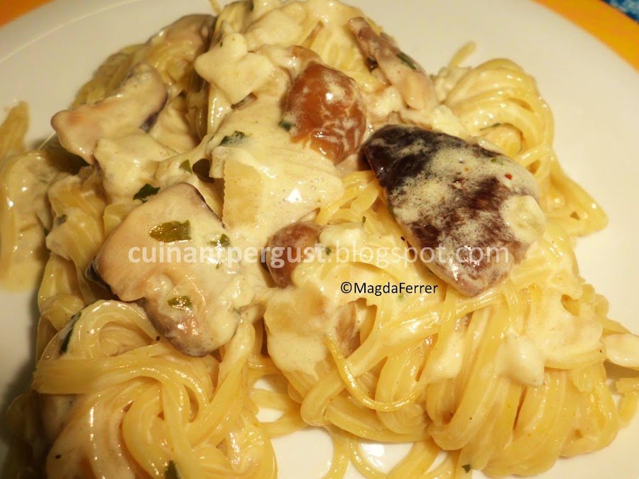 En una sartén grande calentar el aceite de oliva y sofreír la cebolla y el ajo. Cuando empiecen a dorarse añadir las setas y condimentar con una pellizco de nuez moscada y el popurri de pimientas al gusto. Cuando estén tiernas agregar la nata (crema de leche) y el perejil, salar al gusto y dejar que hierva unos minutos para que espese. Rectificar de sal si es necesario. Sin apartar la sartén del fuego añadir los espaguetis para que tomen temperatura. Remover para mezclar con la salsa. Servir.