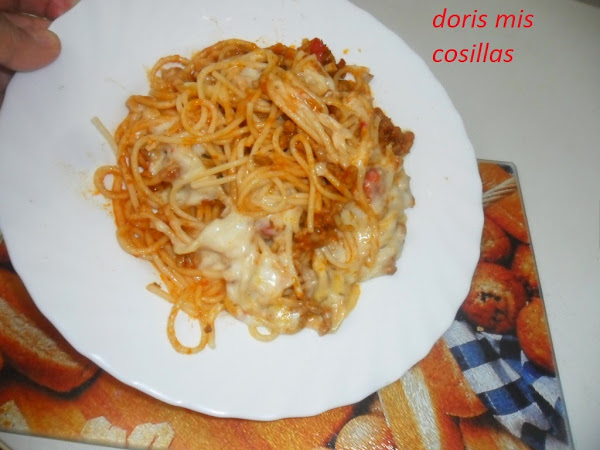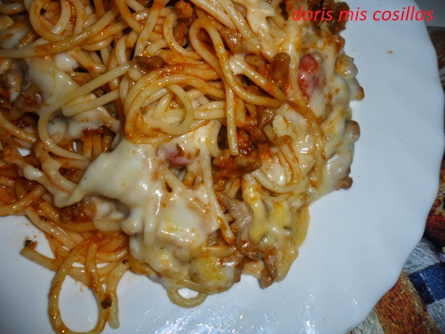 En el momento de servir, agregar la salsa de tres quesos sin pasarnos, agregar un poco de queso rallado y gratinar unos minutos en el horno o microondas. Delicioso ...!!!
