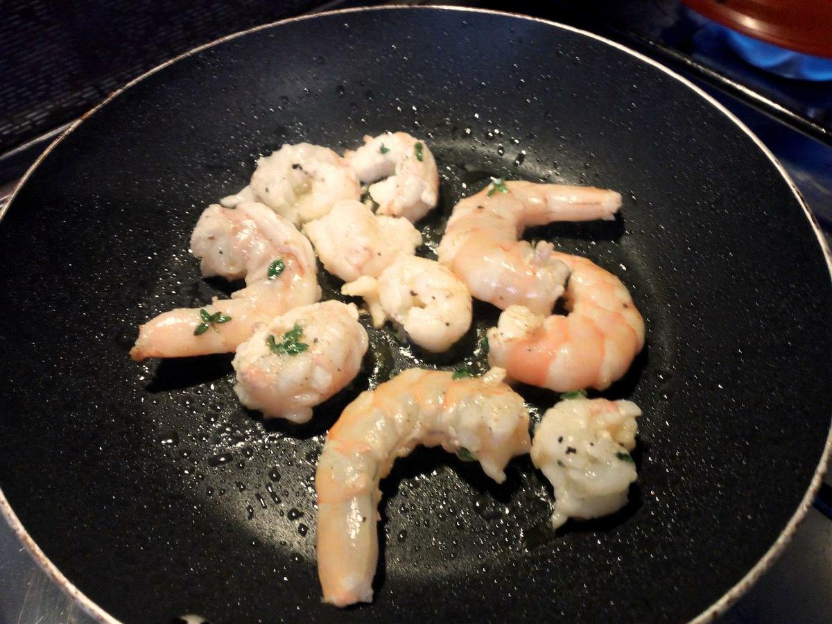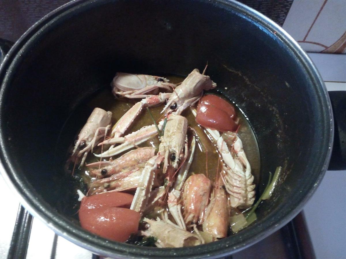 Remover rápidamente, añadiendo agua de cocción, para que se forme una cremita y terminar la cocción de la pasta, por ultimo, incorporar gambas y cigalas.