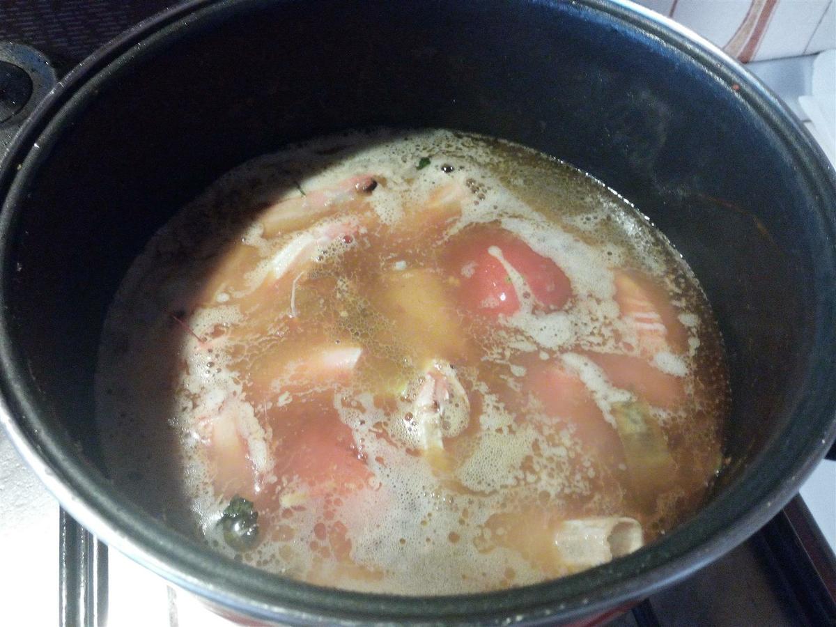 Caldo de crustáceos: cebolla, apio, zanahora, tomates, cabezas de cigalas y gambas, vino blanco o brandy, sal, agua y aceite EVO de Tercio de las Torres.